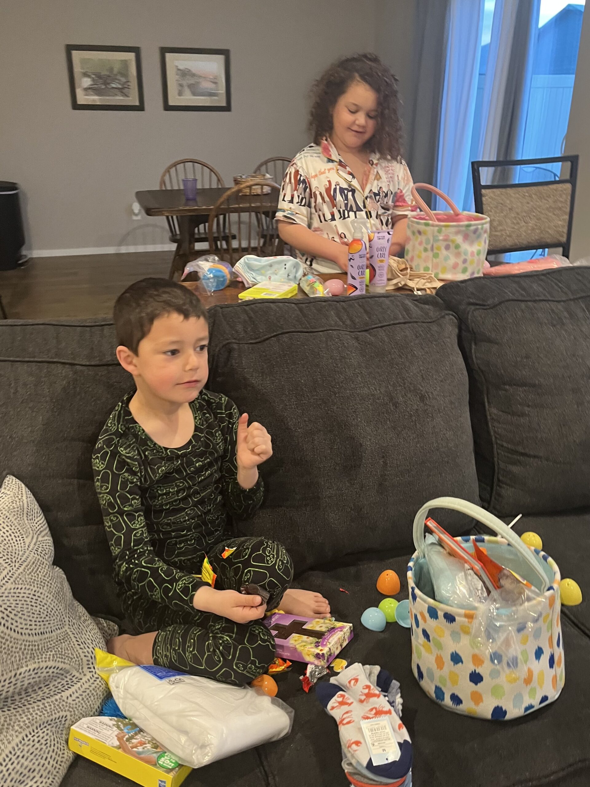Our Easter Sunday started at 6 a.m. when everyone awoke. It was a dash down the stairs to see if the Easter Bunny paid a visit overnight. Much to the delight of Sloan and Beau, he did. Their baskets contained clothes, a book, and some candy.