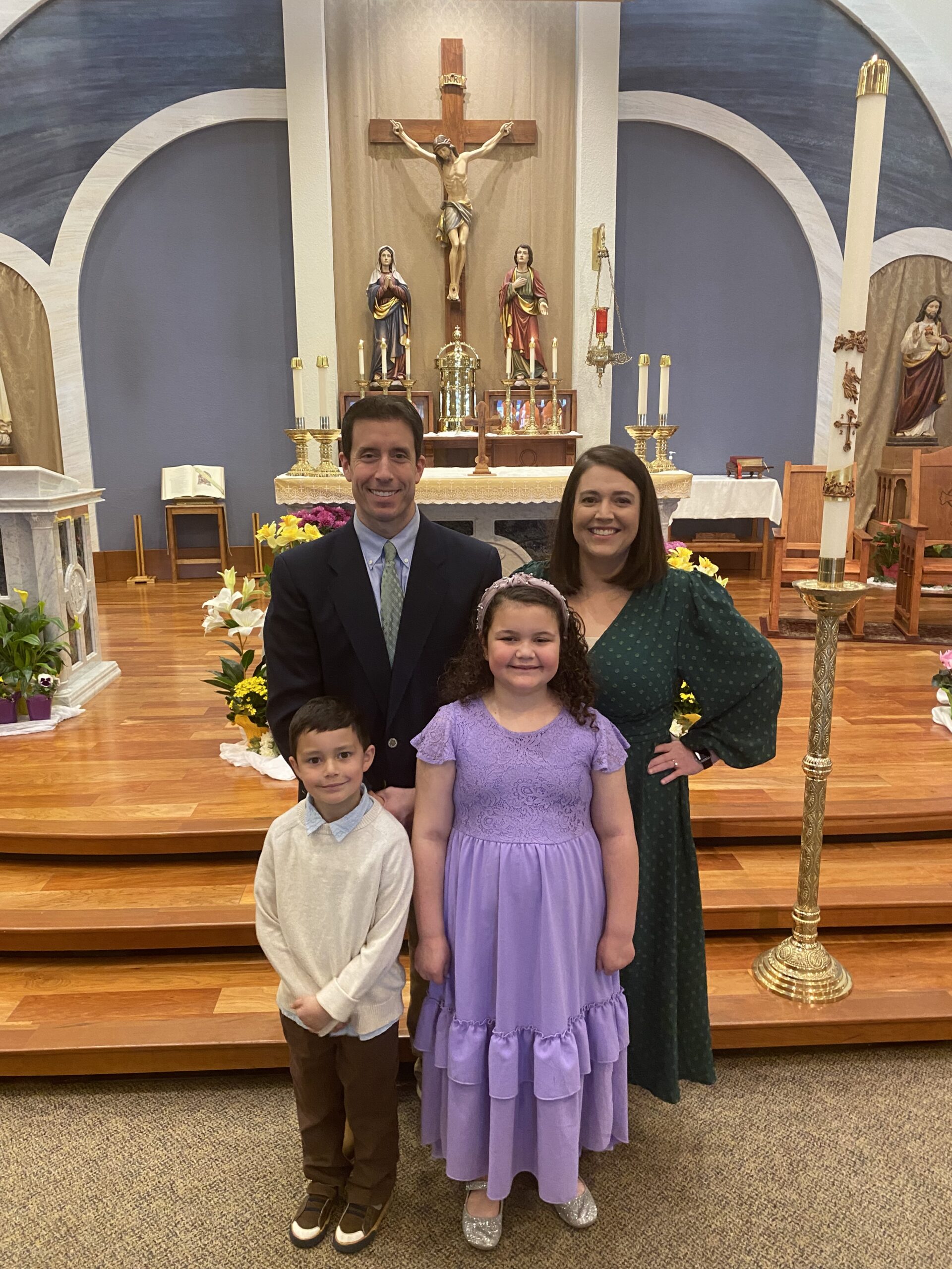 The focal point of the day then took place when we drove to St. Mary Catholic Church for 9 a.m. Easter Sunday mass. My brother, sister-in-law, and niece sat with us in the overflowing quarters of the sanctuary. Speaking of the overflowing quarters, during his homily, Fr. Jeff Lewis spoke about the influx of people not just parish-wide but worldwide joining the Catholic Church. He then preached about an obvious line that separates the world into a pro-Jesus side and anti-Jesus side. He told us to get on the pro-Jesus side. Our family had the honor of bringing down the gifts with our Godson.